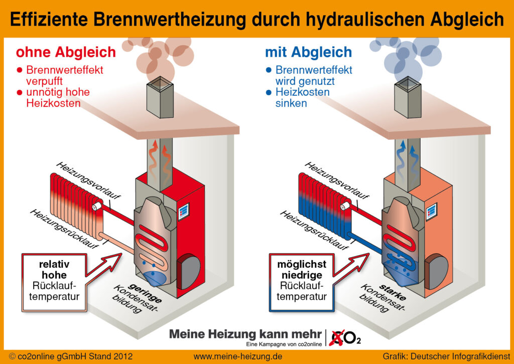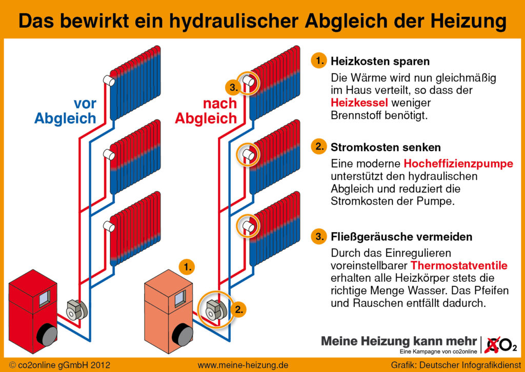 Durch Voreinstellung der Thermostatventile an jedem Heizkörper wird bei einem hydraulischen Abgleich die Menge an Heizungswasser so begrenzt, dass zu jedem Heizkörper genug Wärme transportiert wird – aber nicht mehr als nötig. So wird sichergestellt, dass in der Heizungsanlage stets die richtige Wassermenge mit der richtigen Temperatur zur richtigen Zeit am richtigen Ort ist – und sich die Wärme gleichmäßig im Haus verteilt. Dadurch sinken die Heizkosten und der Wohnkomfort steigt, weil die lästigen Fließgeräusche der Heizung wegfallen.